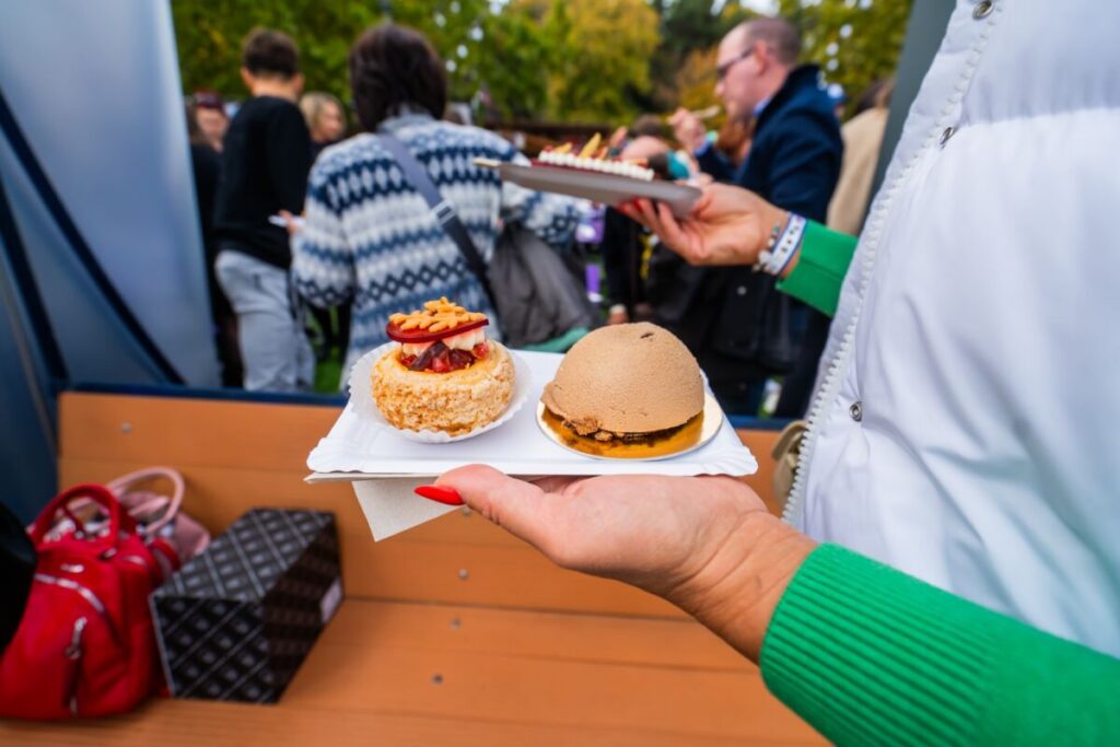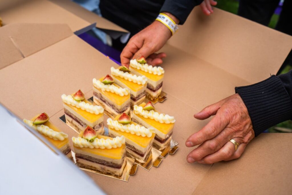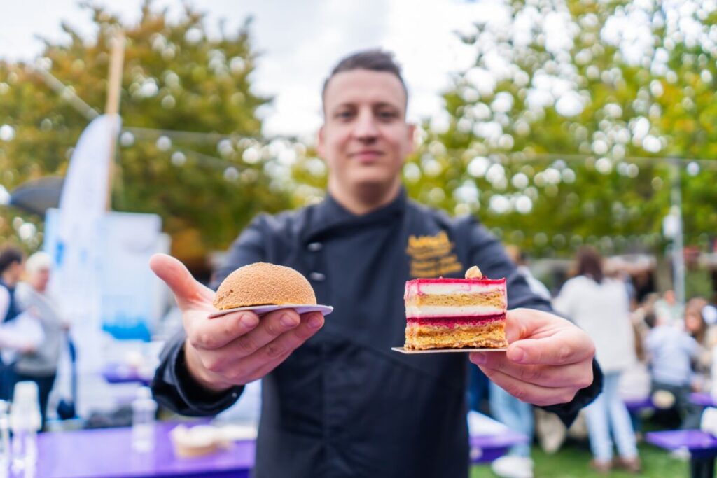 A „Balaton kincsei” desszert áfonya–málna zselével, mogyorómousse-szal és kakaós piskótával készült. A csillogó, arannyal hintett bársonybevonat a Balaton rejtett kincseit idézi: ízeiben és látványában is elegáns, mégis természetes. A sütemény glutén-, tej- és cukormentes, így azok is élvezhetik, akik ételintoleranciával élnek.